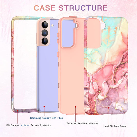 Galaxy S21 plus Case: Marble Pattern 3-In-1 Heavy Duty Shockproof with Rugged Hard PC & Soft Silicone, Rose Gold