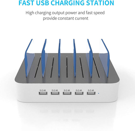 Charging Station for Multiple Devices, MSTJRY 5 Port Multi USB Charger Station with Power Switch Designed for Iphone Ipad Cell Phone Tablets (White, 6 Mixed Short Cables Included)