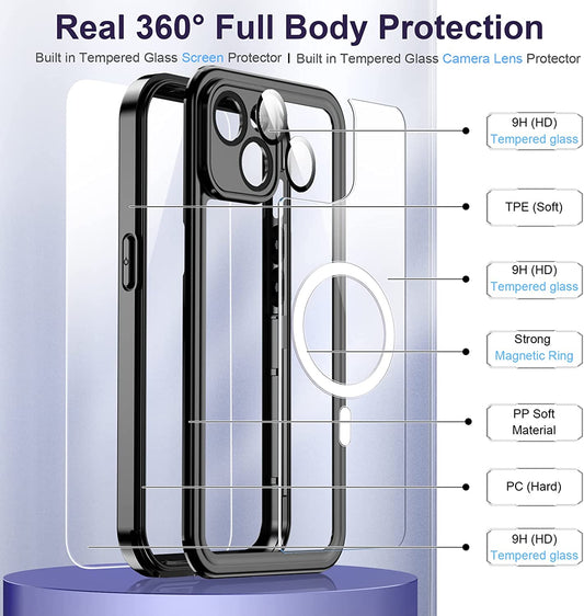 Temdan for Iphone 14 plus Case Waterproof,Built-In 9H Tempered Glass Screen Protector [Real 360][IP68 Underwater][14Ft Military Dropproof][Dustproof][Compatible with Magsafe] - Black-Clear