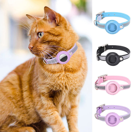 Cat Collar Case for Airtag, Solid Color Faux Leather Reflective Pet Collar for Small Sized Pets Pink XS