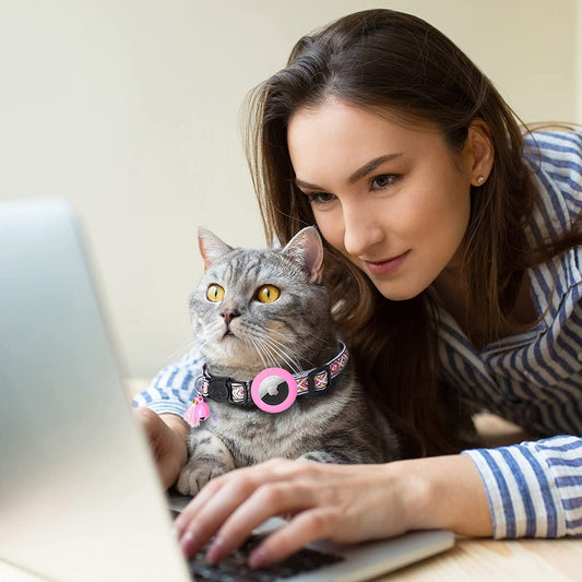 Tom & Spike- Airtag Cat Collar with Bell Adjustable Breakaway Kitten Collars:- Safety Buckle and Silicone Air Tag Holder Case Compatible with Apple Airtag Geometric Pattern Pet Collar,Pink
