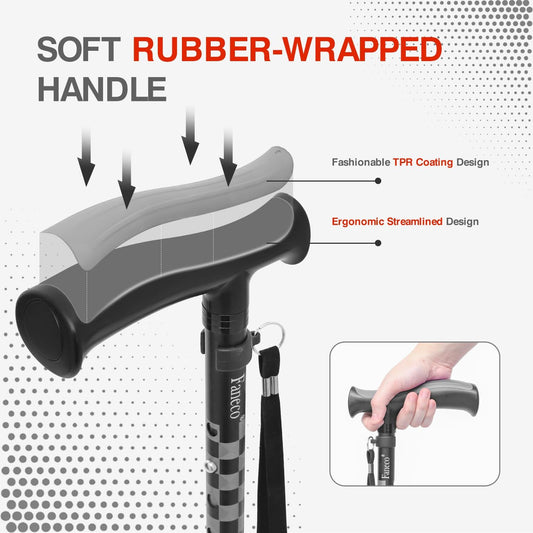 FANECO Walking Cane for Elderly, Folding Walking Stick for Seniors, Pivoting Quad Base, Lightweight Adjustable Walking Stick for Men/Women