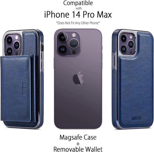 MOHEYO Coque conçue pour iPhone 14 Pro Max compatible avec Magsafe portefeuille amovible porte-cartes magnétique fine en cuir végétalien (bleu)
