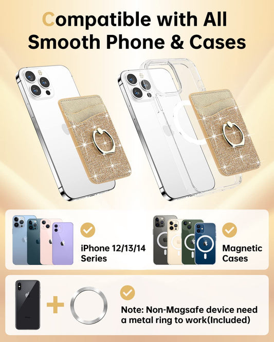 Gospire Magnetic Phone Wallet, Leather Cell Phone Card Holder, Magsafe Wallet with Ring & [Credit Card RFID Blocking] 360°Rotation Phone Stand Compatible with All Smartphones with 2 Metal Rings, Gold