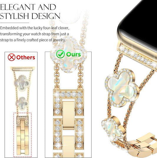 CTYBB Bling Womens Band Compatible with Apple Watch Band 40Mm 41Mm 38Mm Series 9 8 7 6 5 4 3 2 1 SE, Sparkle Diamond Replacement Bracelet Wristband, Cute Lucky Clover Dressy Iwatch Band,Gold/White