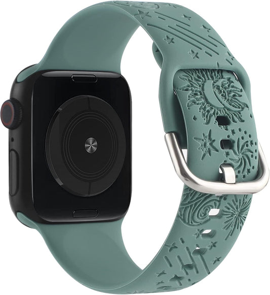 Crescent Sun and Moon Engraved Silicone Band Compatible with Apple Watch 38Mm 40Mm 41Mm for Women Men,Celestial Boho Laser Printed Soft Silicone Sport Wristbands Replacement Strap with Classic Clasp for Iwatch Series SE 9 8 7 6 5 4 3 2 1