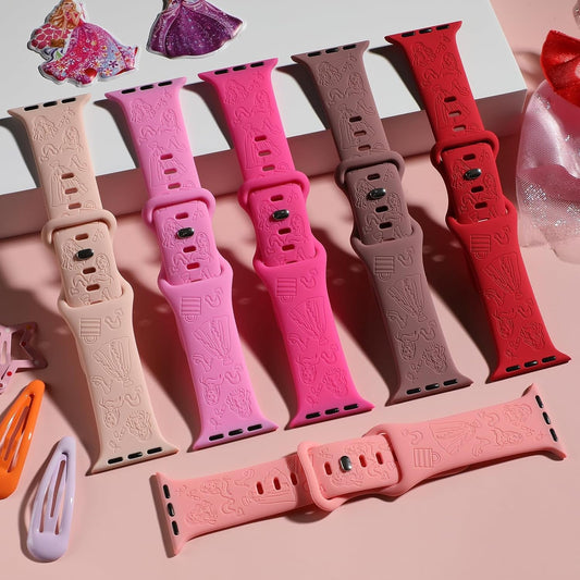 6 Packs Cartoon Engraved Bands Compatible with Apple Watch Band 40Mm 38Mm 44Mm 45Mm 49Mm 42Mm Women, Designer Silicone Cute Soft Strap for Apple Watch Ultra 2 Iwatch Series 9 8 7 SE 6 5 4 3 2 1