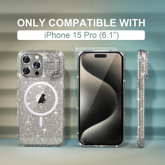 Choiche Magnetic Case for Iphone 15 Pro Case, Women Clear Glitter Sparkly Case, [Slide Camera Cover & 3 Diamond Camera Lens Protectors & 2 Screen Protectors] [Compatible Magsafe] (Glitter Clear)