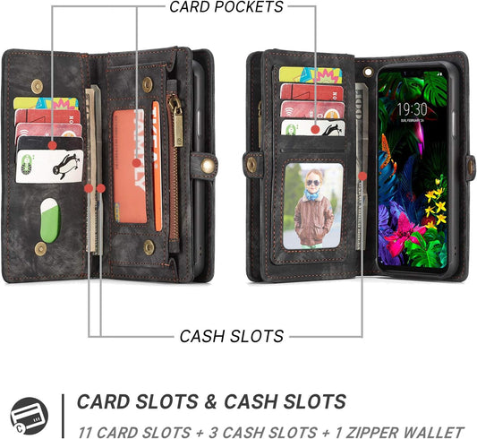 Simicoo LG G8 Thinq Portefeuille en cuir avec fermeture éclair et emplacements pour cartes amovibles - Dragonne magnétique - Poignée antichoc - Poche portefeuille pour LG G8 Thinq (Noir, LG G8 Thinq)