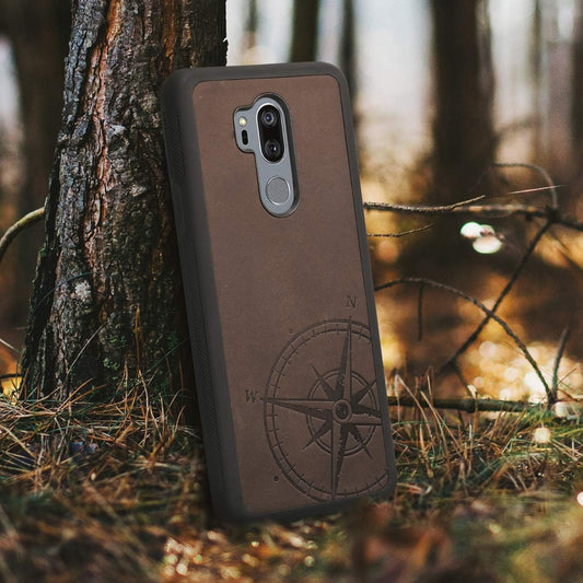 Kalibri Coque compatible avec LG G7 Thinq/Fit/One – Coque de protection en cuir véritable lisse pour smartphone – Boussole de navigation Marron