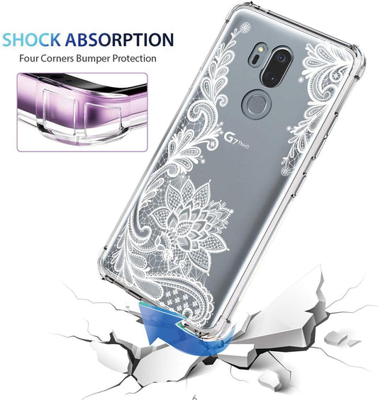 KIOMY Coque antichoc en forme de fleur pour LG G7, LG G7 Thinq transparente avec motif dentelle blanche, protection souple, fine, coque arrière pour téléphone portable, fille, henné floral, gel en caoutchouc TPU pour femme et fille