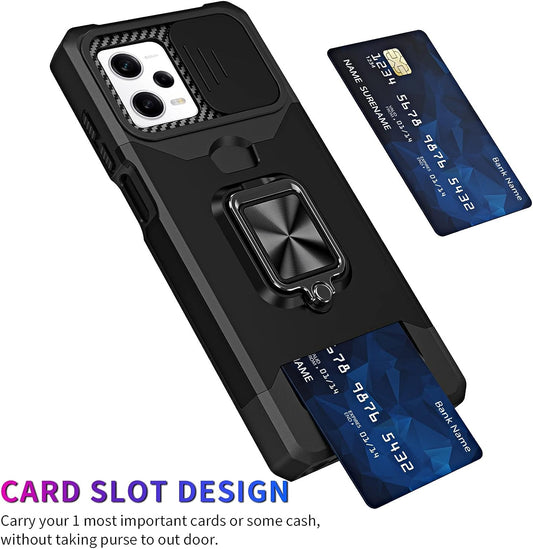 Tncavo Coque pour Xiaomi Poco F5 avec porte-cartes, qualité militaire, résistante aux chocs, protection robuste avec anneau rotatif, béquille et coque d'appareil photo pour Xiaomi Redmi Note 12 Turbo LJ Noir