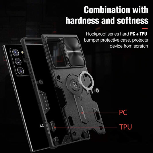 Nillkin Coque pour Samsung Galaxy Note 20 Ultra, [Béquille intégrée et coque coulissante pour appareil photo] Dos en polycarbonate rigide résistant aux chocs et coque hybride en silicone souple pour Galaxy Note 20 Ultra 6,9" Noir