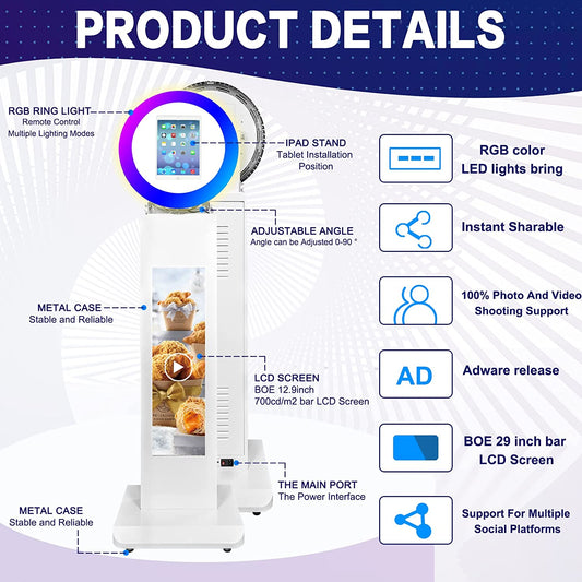 RXFSP Photomaton portable pour iPad 12,9" avec écran LCD, machine à selfie, coque en métal portable, support réglable, machine photo avec anneau lumineux LED RVB pour mariage, Halloween, Noël
