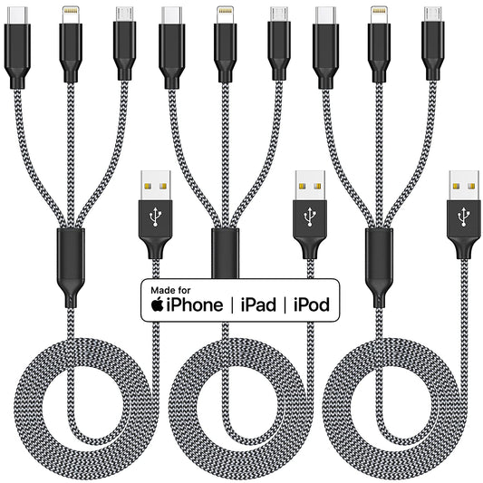 Câble de chargeur multiple, paquet de 3 câbles de chargement USB rapide 3 en 1 de 4 pieds avec connecteurs USB de type C/micro/Lightning pour téléphones portables et plus (gris noir)