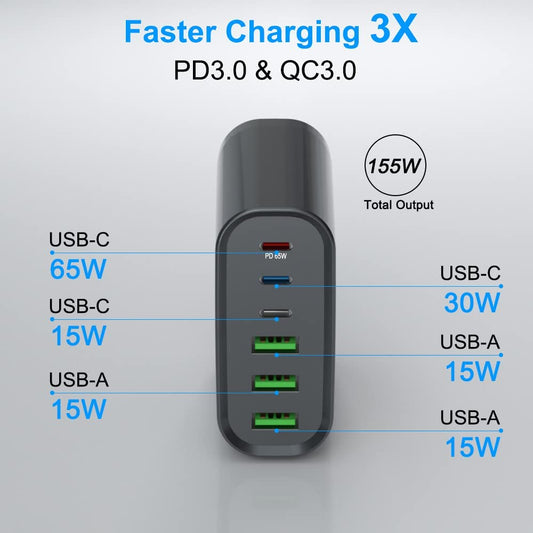 Chargeur rapide USB C, station de charge USB C 155 W, bloc de chargeur mural Gan 6 ports USB C, adaptateur d'alimentation USB C multiport portable pour Macbook Pro/Air, iPad Pro, iPhone 14/13/Mini/Pro/13Pro Max/12 Galaxy Note