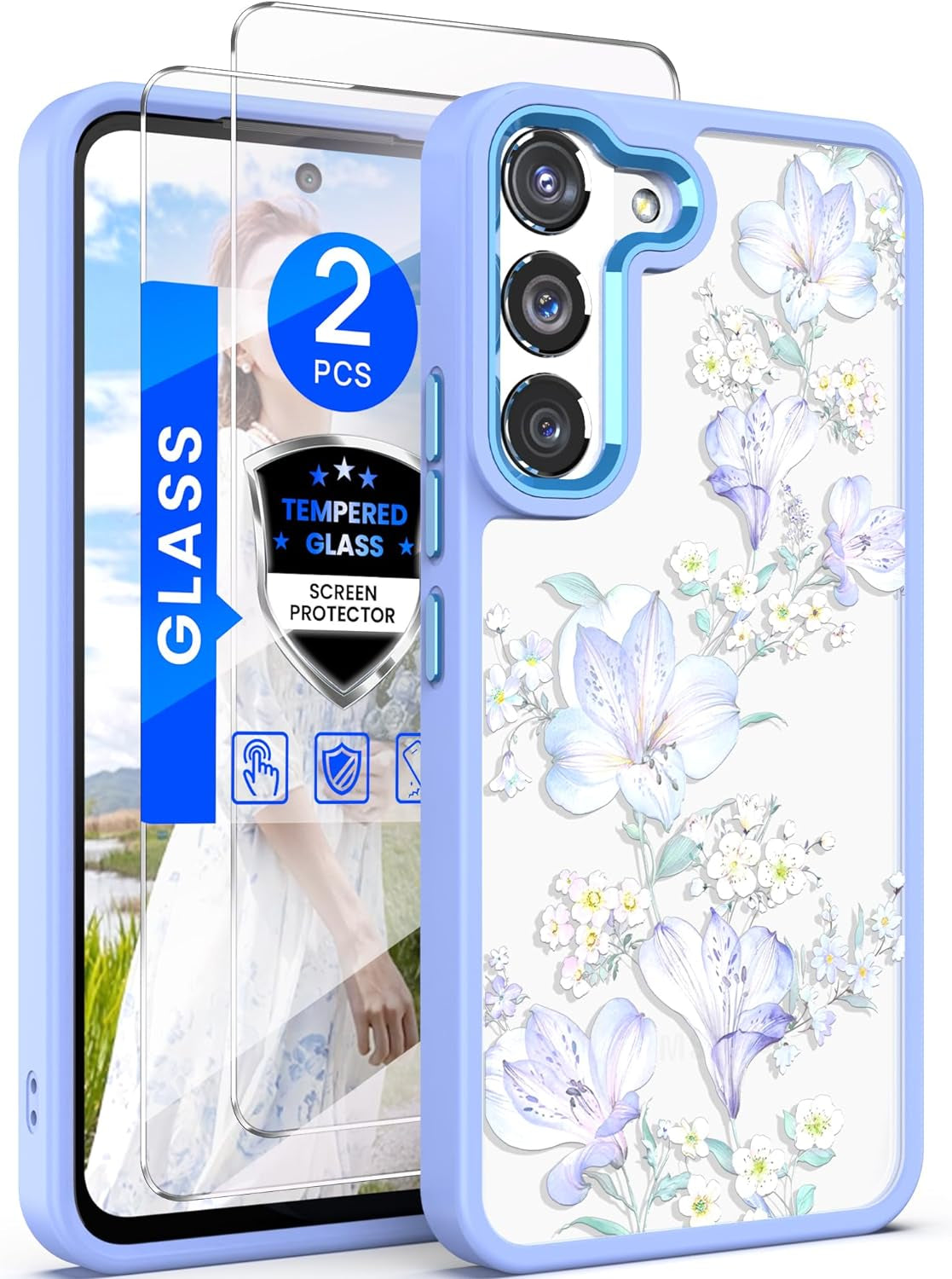 Dretal for Samsung Galaxy S22 5G Case Floral, Military Grade Drop Tested Hard Back & Soft Edge Slim Flower Women Girls Phone Protective Cover + Tempered Glass Screen Protector (Deep Purple)